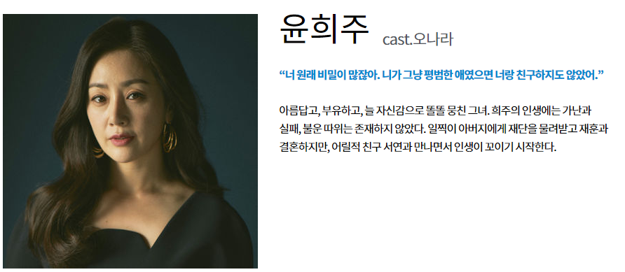 99억원에 나온 현재 등장인물과는 반대로 유복한 집안에서 성장했다는걸 소개에서 어느정도 파악할수있습니다. 윤희주(오나라)는 조금 불운의 캐릭터로 나올 확률이 높습니다. 상위권에서 밑으로 추락하는 모습이 나오지 않을까 생각을 합니다. 더군다나 남편인 이재훈마져 정서연과 불륜이 있다고 암시를 하고 있기 때문입니다.
