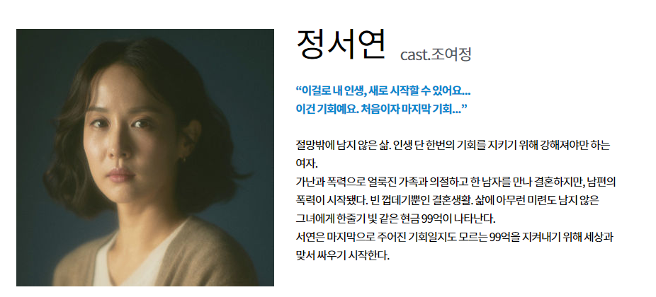 99억원이라는 큰돈을 가져서 인생일대의 큰 기회를 얻었습니다. 가난과 폭력으로 가족과 의절을 하였고, 한남자를 만나 결혼했지만 이남자 홍인표 또한 폭력을 합니다. 망한 결혼생활이지만 한줄기의 빛인 현금 99억이 나타납니다.