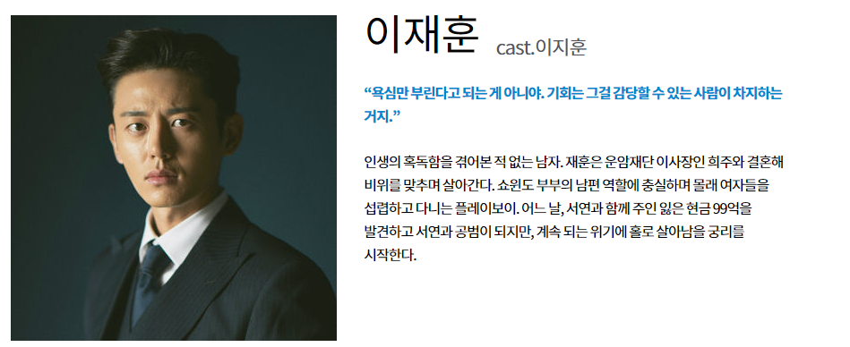 윤희주(오나라)의 남편역으로 나온 이재훈(이지훈)입니다. 인생의 혹독감을 겪어본적이 없고 재단 이사장인 희주와 결혼을해서 아내의 비위를 맞춰가며 살아가고 있는 힘없는 남자의 역할이 나옵니다. 밖에서 보여지는 부부의 행복한 모습에 충실하고 몰래 여자들을 만나고 다니는 플레이보이로 나옵니다. 같이 서연과 주인을 잃은 99억원을 발견하게 되는 인물로 같이 공범이되고 이 위기를 빠져나갈 궁리를 하는 의리없는 인간의 모습으로 나온다고 합니다.