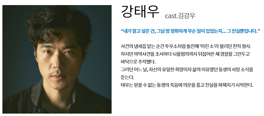 강태우(김강우) 전직형사에서 경찰을 그만두고 바닥으로 추락한 인물로 동생의 사망소식에 진실을 파헤치는 인물입니다.