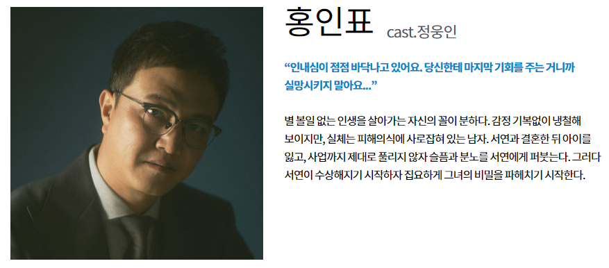 홍인표(정웅인) 피해의식에 찌든 남편의 역을 하고있습니다. 폭력적이라고 합니다. 서연(조여정)이 수상하게 행동을하자 그녀의 비밀을 파헤친다고 하네요. 제가 요즘 많이보는 드라마 vip와 반대의 경우긴합니다. 물론 서연은 불륜은 아니지만. 악역이기 때문에 99억원을 서연이 가져갔다는걸 몰랐으면 하는 바램이 있습니다.