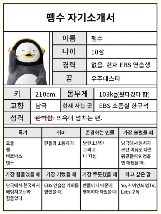 원래 펭수를 기획안 EBS의 이슬예나 PD는 올 2월에 펭수를 만나고 연습생으로 키우면서 유아층부터 초등학년 고학년 까지 좋아하는 캐릭터로 만드는게 목표였다고 합니다. 그래서 펭수는 10살이죠.
