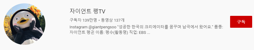 그리고 펭수의 유튜브 채널(자이언트 펭TV) 이제 거대해져서 구독자수 139만명을 찍는 엄청난 파워를 보여주기도 했습니다. 왠만한 100만때 구독자를 보유한 채널은 영상이 엄청 많은데 이례적으로 137개로 골드버튼까지 질주를 했습니다.