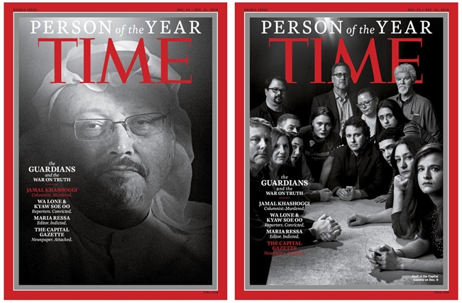 2018년에는 기자들이 뽑혔는데요. 사우디 언론인 자말 카슈끄지, 로힝야 난민 사태 보도 때문에 미얀마 정부에 구금이 되었던 로이터 통신기자 2명으로 선정을 했습니다. 이들을 비롯해 진실을 수호하다 숨지거나 탄압받은 언론인들 선정하며 수호자들과 진실에 대한 전쟁이라고 표현을 했습니다.
