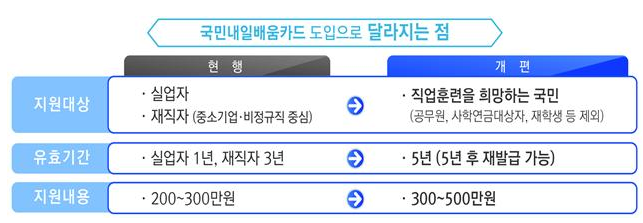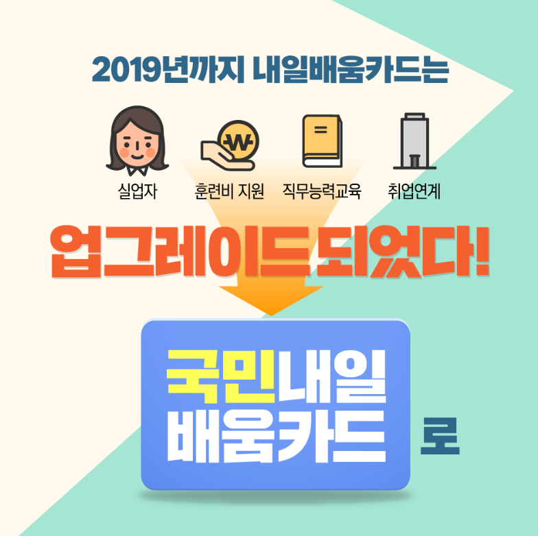 이전까지는 실업자와 재직자로 구분해서 지원을 했었지만, 특수형태의 근로자와 자영업자 아르바이트등 직업형태가 다양해지면서 직업훈련을 받을 수 없는 경우가 많아졌고, 더많은 청년들이 지원을 받을 수 있게 통합을 했다고합니다.