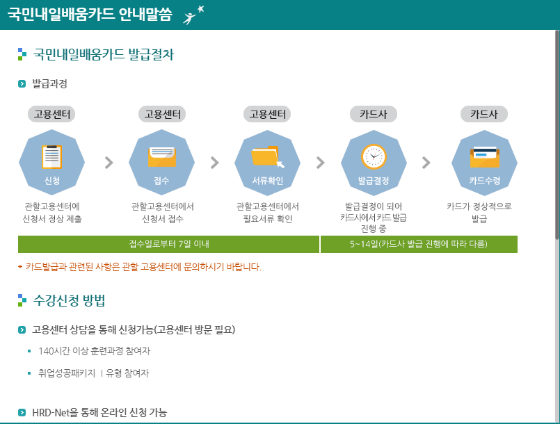 신청은 가까운 시에 있는 고용센터를 방문하고나 직업훈련포털 HRD-NET을 통해서 신청이 가능합니다.