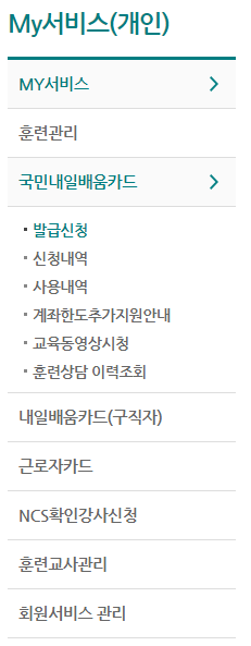 my서비스(개인)탭에서 국민내일배움카드탭에서 발급신청을 눌러주세요.
