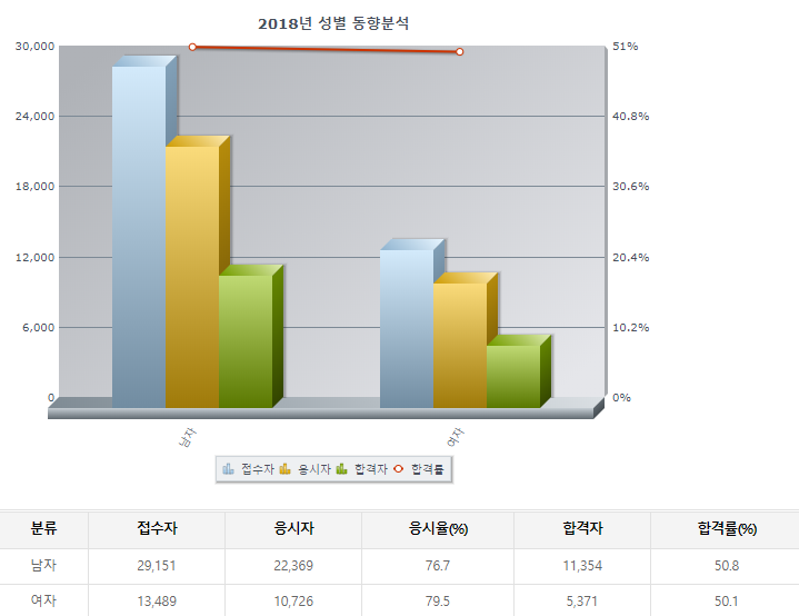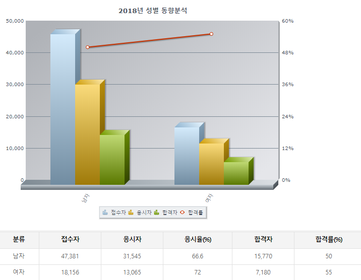 시험은 대략적으로 1년에 4~5만명정도 시험을 보며, 합격률이 해마다 차이는 나지만 최저 32.7&에서 57.5%까지 보여줌.