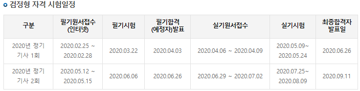 필자가 시험볼때는 3회정도 있었던것 같은데 2020년에는 자격 시험일정이 2회밖에 없다.