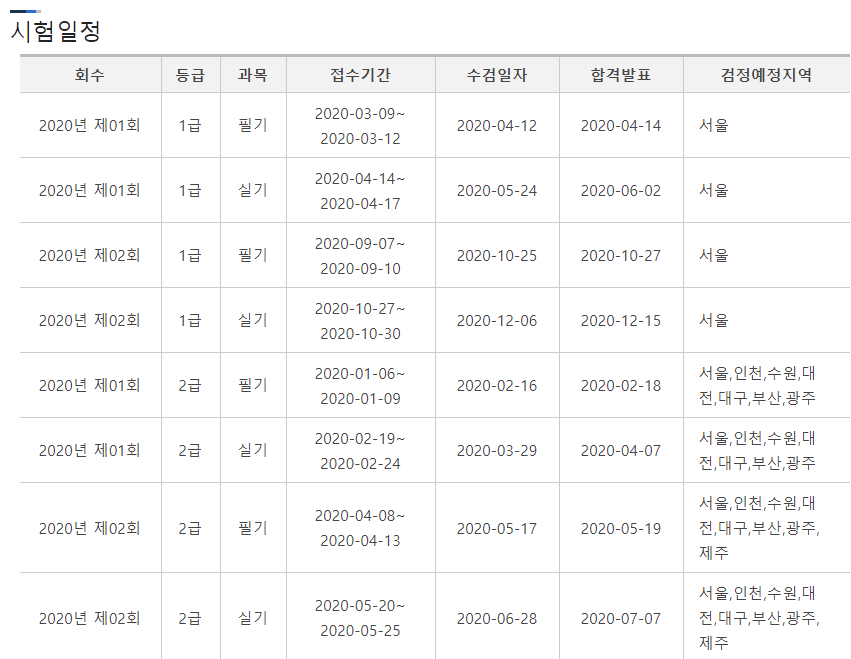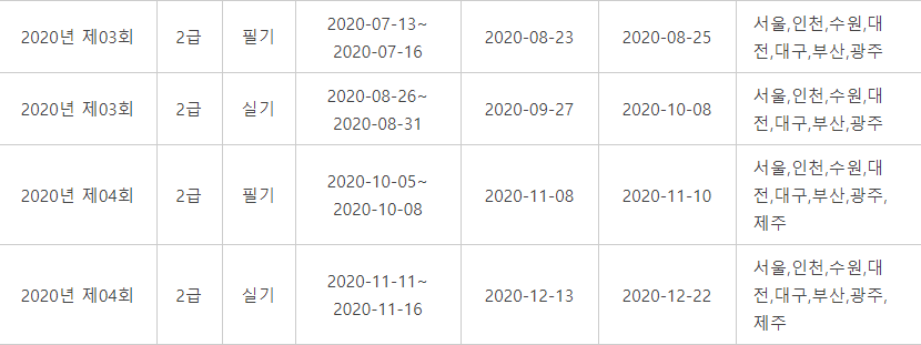 네트워크 관리사의 시험일정입니다. 좀 확인을 잘해야하는데 1급의 경우는 연 1,2회의 시험이 있고 2급의 경우에는 총 4회의 시험이 주어집니다. 그리고 시험장소가 다른시험처럼 많진 않습니다. 그만큼 응시하는 인원수가 적기 때문입니다.