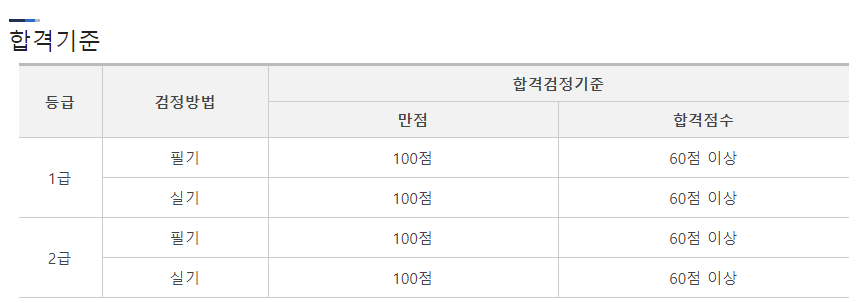 합격기준은 1,2급기준으로 모두 100점만점에 60점으로 다른 자격증과 똑같습니다.