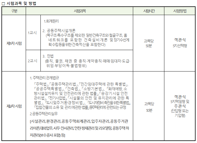 주택관리관계법규와 공동주택관리실무에대해서 시험을 봅니다.