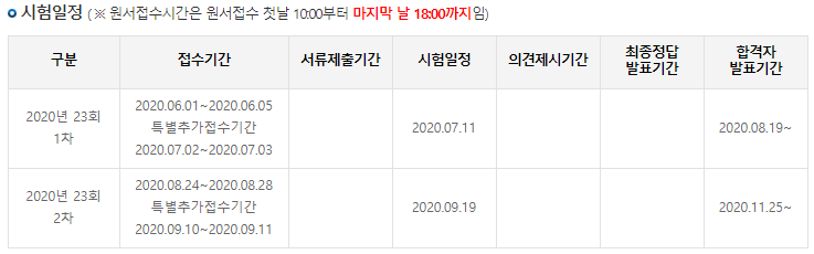 주택관리사보의 시험일정입니다. 일년에 1회를하고 1,2차의 시험일정이 따로입니다. 공인중개사와 약간 차이점이 있습니다. 1차를 응시를하고 합격한후 바로 2차 접수가 가능합니다.