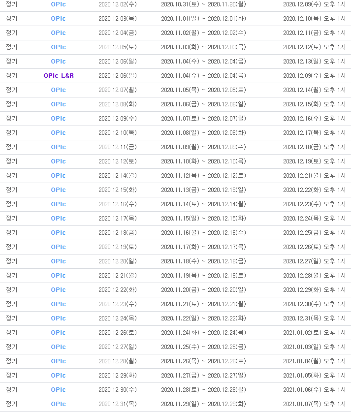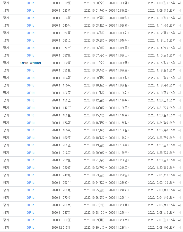 오픽 시험은 거의 연간 모든날에 시험이 있다고 생각해도 될정도로 대부분의 날이 시험일입니다.