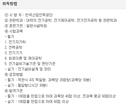 전기기사 시험은 기사 중 몇손가락안에 들정도로 굉장히 어려운편이라고 한다. 특히 관련학과생들이 공기업을 준비한다면 선택이 아닌 필수라고 한다. 이유는 NCS도입이후에 학벌을 보는것보다 직무역량을 중요시함에 따라서 중요성이 더 커졌다고한다. 취준을할때 기사 두개 (전기기사, 전기 공사기사)를 목표로 하고 공부를 하는게 일반적이다.