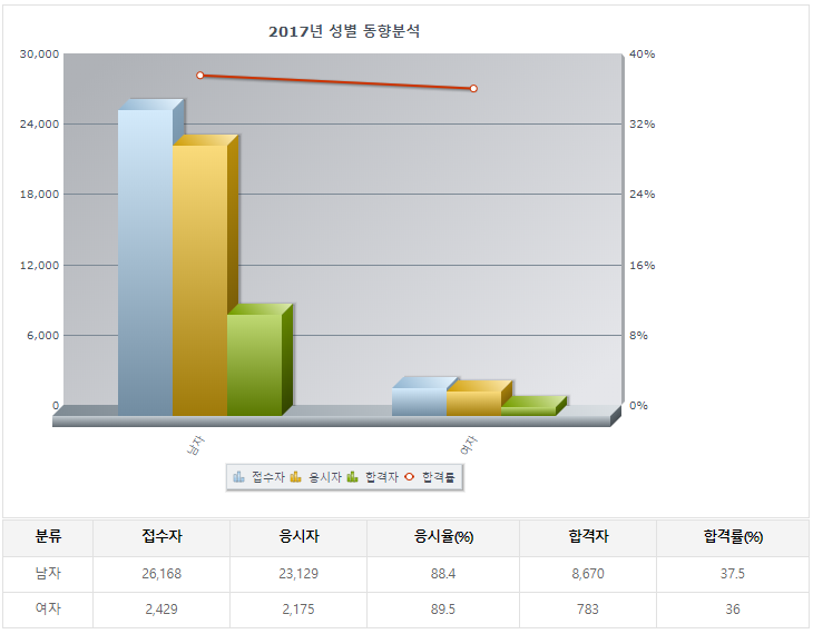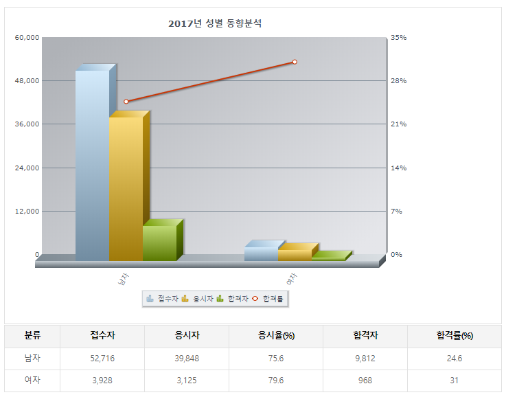 2017년도 기준은 필기에서 남자 24% 여자 31%가 합격을 했고, 실기기준 36.5%내외의 합격률이 나왔는데, 쭉 조사를 해보니 합격률이 다른 년도보다 매우 높았다. 필기 응시인원도 전년도 대비 약 5천명이 증가했다.