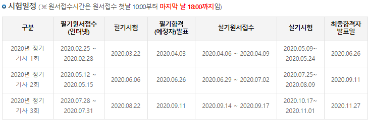 2020년도 전기기사의 시험일정이다. 총 3회로 구성이된다. 다른 상위자격증보다는 회차가 넉넉해보인다.