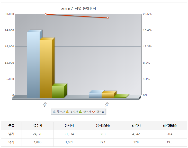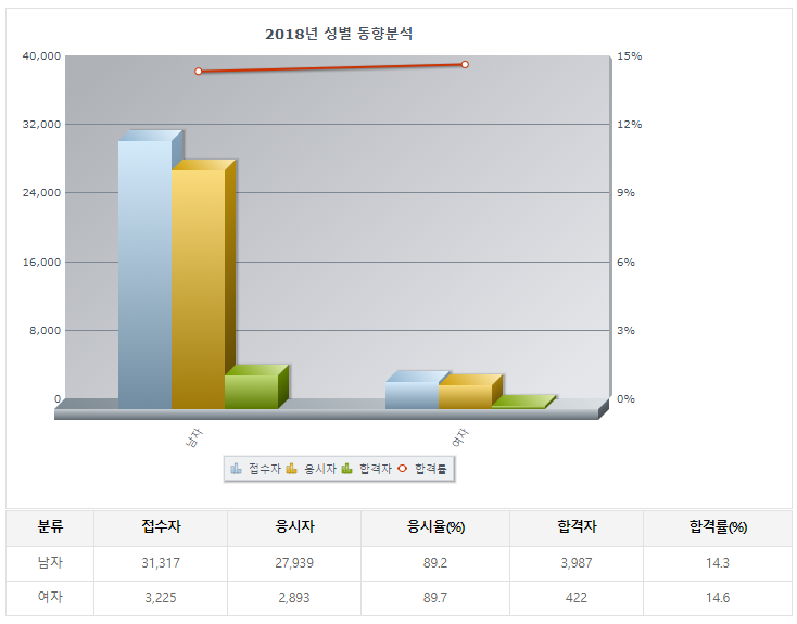 2018년도 접수자가 더증가를 했다. 해마다 약 3~5천명이 증가를 한다. 필기 남자 26.8% 여자 34.6%