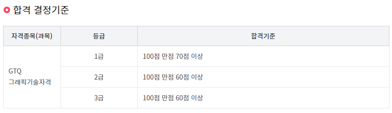 GTQ 포토샵 1급 합격기준 가장 높은 등급이다보니 100점 만점 70점이상이 나와야 하며, 나머지는 100점만점에 60점 이상이면 합격 결정 기준에 들어간다.