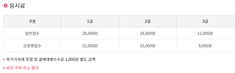 응시료는 1급이 28,000원, 2급 19,000원 3급 12,000원으로 구성이 됩니다.