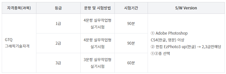 GTQ 포토샵 자격증별 시험시간및 소프트웨어버전