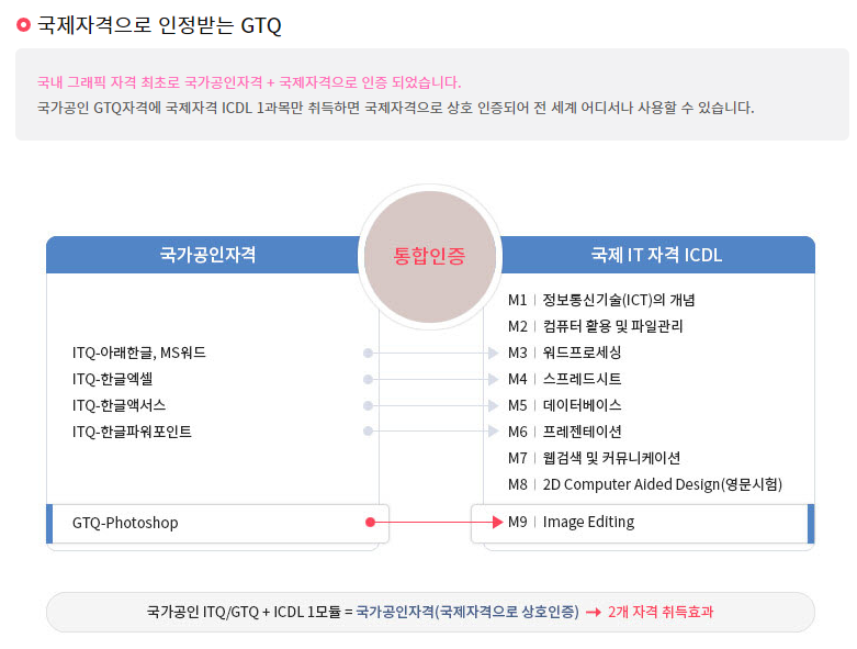 GTQ 포토샵 1급의 장점을 보면 국제자격으로 인증을 받으면, 국제자격으로 상호 인증되어 전 세계 어디서나 사용이 가능하다고 합니다. 대부분 자격증이 거품이 껴있어서 막상 취업을 할때 아무도 인정해주지 않는 경우가 있는데, 그래도 디자인쪽으로 전공을하거나 이쪽 계열로 간다면 있으면 나쁘진 않다 정도로 인정을 받을 것 같음. 어떤 계열이나 똑같은데 있는것과 없는것은 차이가 있음.