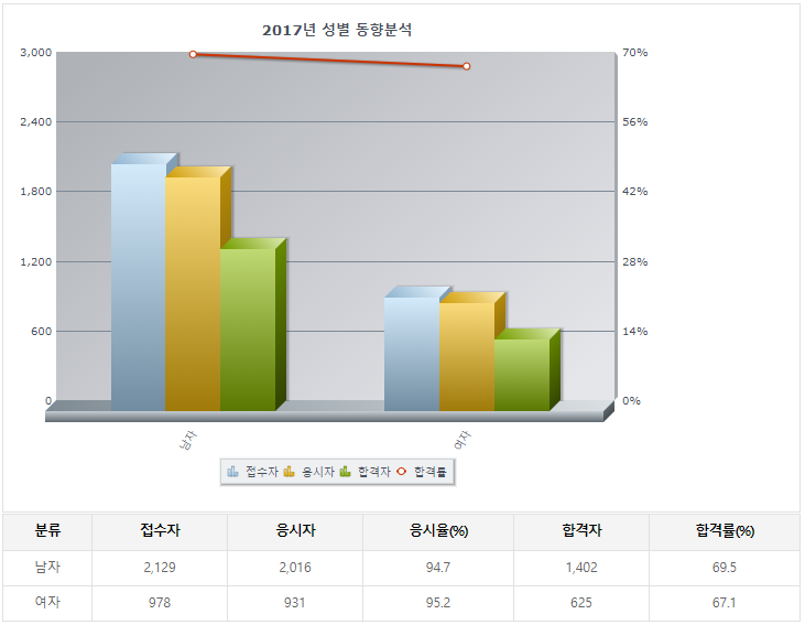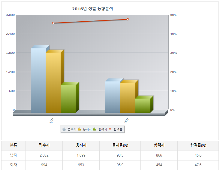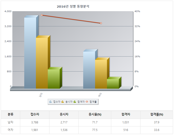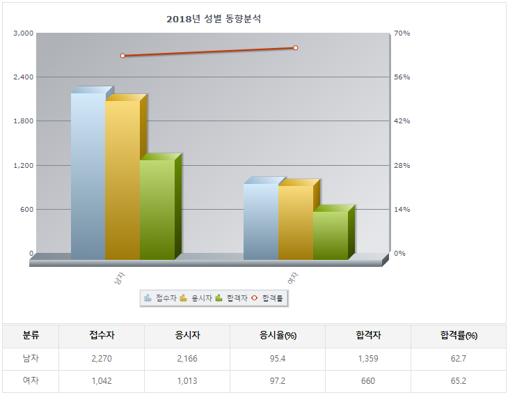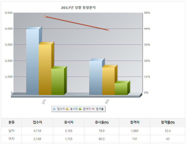 2018년기준 필기 6400명정도가 응시를 하였으며 필기 합격률은 남 53% 여 44%로 매우 높았음.