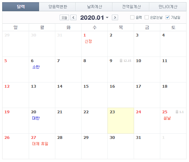 1월 달력을보면 24일부터 26일까지는 지정된 휴무나 27일은 대체 휴일로 잡혀있습니다.