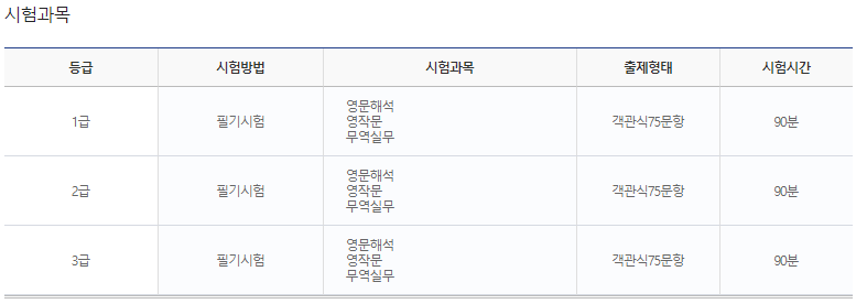1과목 영문해석, 2과목 영작문, 3과목 무역실무로 구성이된다.