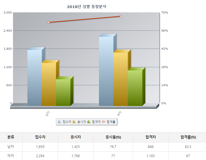 지금까지 작성했던 자격증에 비해서 합격률은 상당히 높다. 접수자 자체가 만명을 넘기진 않는다. 남성보다 여성이 더 많이 보는 시험중 하나다. 2016년까지는 50%이상의 합격률을 보이다가 2017년부터는 60%이상의 합격률을 보인다.