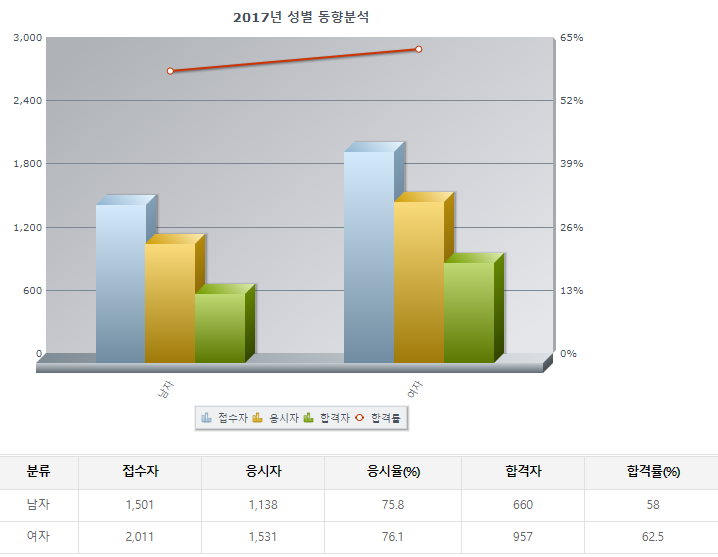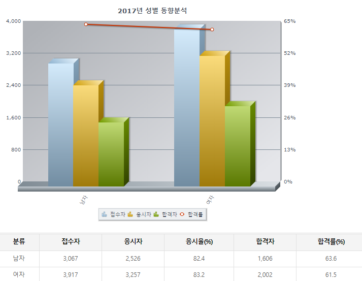 지금까지 작성했던 자격증에 비해서 합격률은 상당히 높다. 접수자 자체가 만명을 넘기진 않는다. 남성보다 여성이 더 많이 보는 시험중 하나다. 2016년까지는 50%이상의 합격률을 보이다가 2017년부터는 60%이상의 합격률을 보인다.