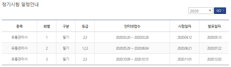 2020년 기준 유통관리사 시험일정이다.