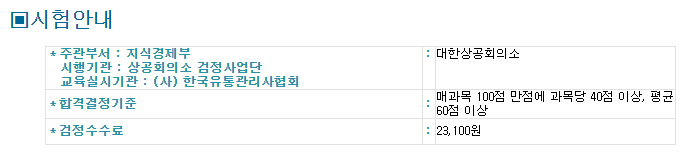 유통관리사 검정 수수료는 공통적으로 23100원이며 원서접수는 대한상공회의소에서 접수가 가능하다.