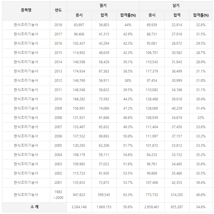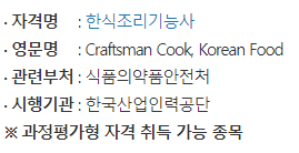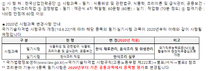 예전 한식조리기능사는 일식,중식,양식 구분없이 필기시험이 모두동일 했지만, 올해부터 모든 조리기능사 필기시험이 개편되어 필기 내용이 변경이 되었음. 시험시간은 1시간이며 4지선다형 60문제를 풉니다. 다른 기사자격증 똑같이 60점이상이 나와야 합격을 할수있음. 과목은 한식재료관리, 음식조리 및 위생관리 구성이 됩니다.