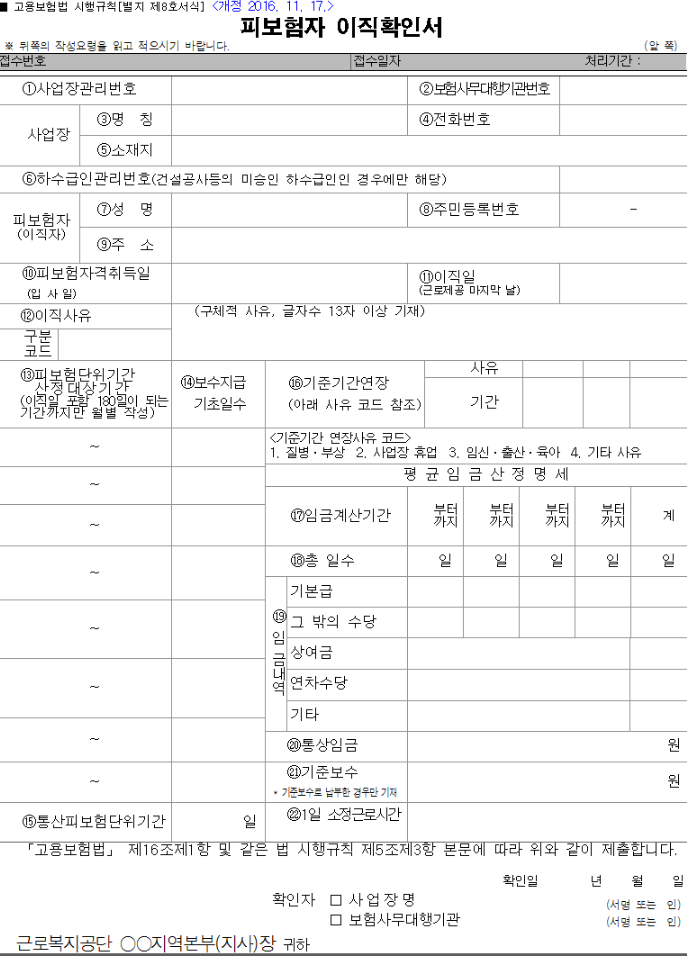 고용보험 피보험자가 이직을 하거나 실직을 하여 실업급여를 신청을 할때 피보험자자격상실신고서와 함께 제출을 하는데 인터넷에서 양식을 다운받고 사용이 가능하다.