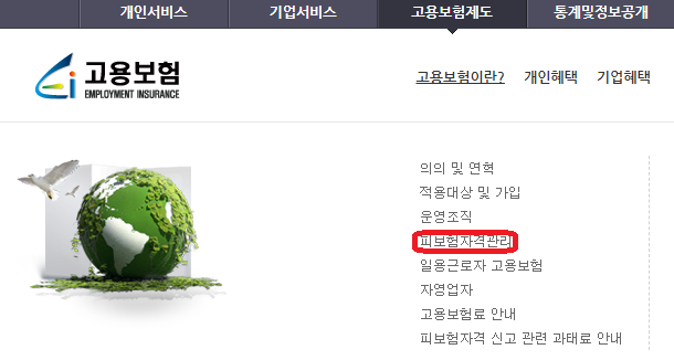 고용보험사이트에 탭이 여러가지가 있는데 상단 3번째의 고용보험제도 > 피보험자격관리를 들어가 줍니다.