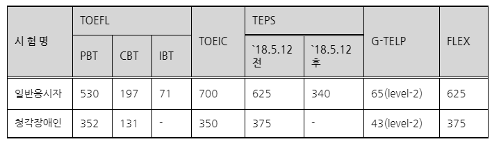 기본적으로 토익 700점, GTELP 65점 신탭스 340점이상이 필요함.