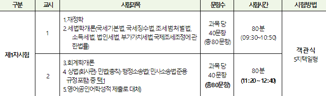 합격기준 : 과목당 100점 만점으로 하여 각 과목의 점수가 40점 이상이고, 전 과목 평균점수가 60점 이상인 사람을 합격자로 결정한다. 다만 각 과목이 40점 이상이고 전 과목 평균점수가 60점 이상인 사람의 수가 최소 합격인원보다 적은 경우에는 최소합격 범위에서 모든 과목의 점수가 40점이상인 사람 중에 전 과목 평균점수가 높은 순서로 합격자를 결정한다고 한다.