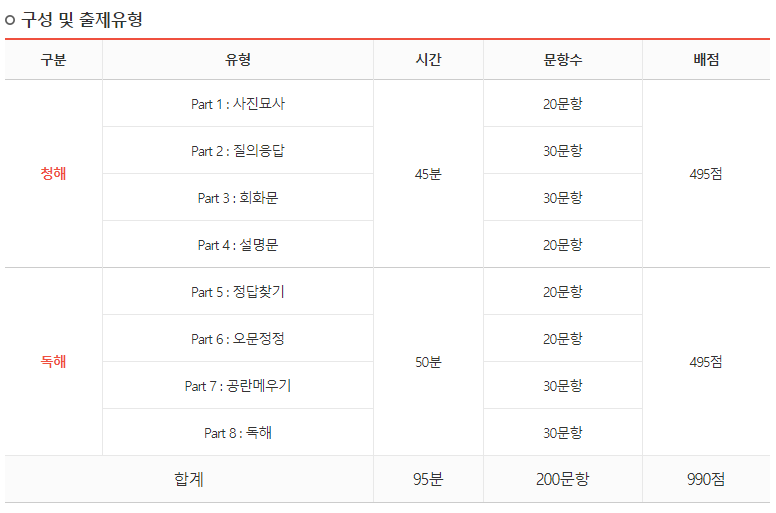 총점은 990 만점으로 듣기 495점 / 독해 495점으로 나뉜다.