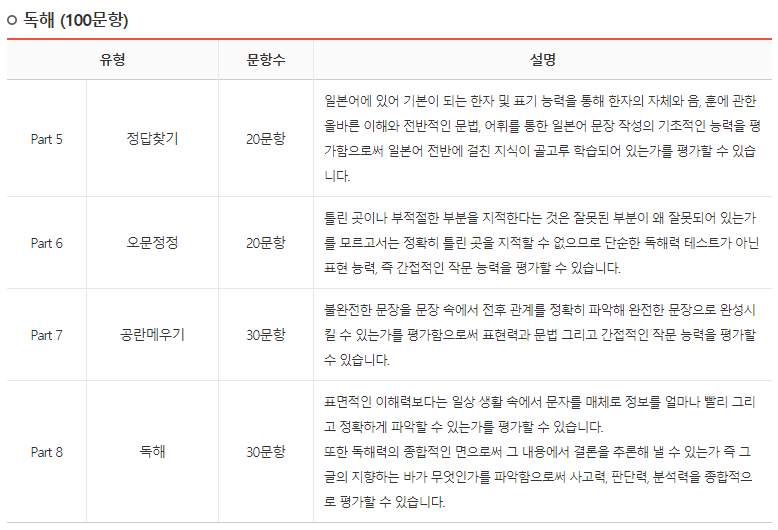 JPT 시험의구성 YBM시사에서 만들다보니 토익과 유사하게 파트1부터 8까지 나뉜다.(토익은 파트 7까지있다.)