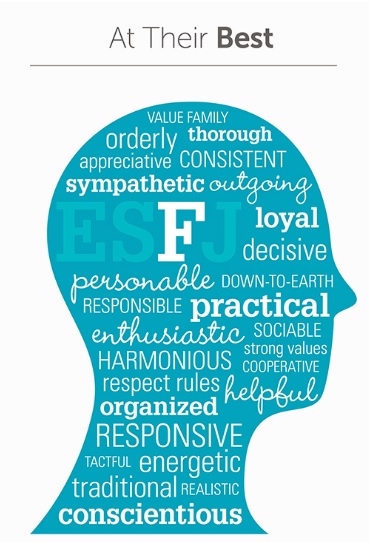 ESFJ를 선호하는 사람들은 종종 다른 사람들에게 잘 적응하여 감정적 요구와 우려를 이해하고 공감을 나타냅니다. 그들의 파트너, 동료, 가족 및 친구들은 그들이 책임감 있고 돌보는 것으로 볼 것입니다.