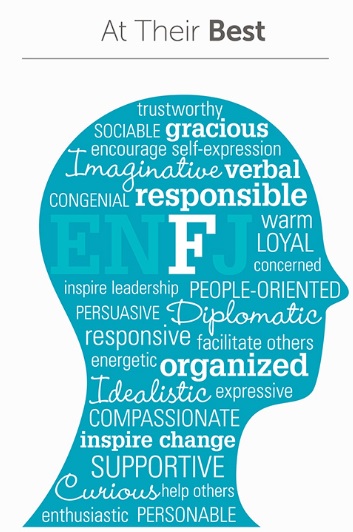 ENFJ를 선호하는 사람들은 다른 사람들의 가치와 그룹의 장점과 자신의 가치에 따라 좋은 결정을 내립니다. 자연스럽게 환경에서 조화를 이루기 위해 개인과 팀의 장기적인 발전을 지원하고자합니다. NF에 대한 그들의 선호는 그들이 세계에서 의미 있고 장기적인 차이를 만들도록 동기를 부여 받았으며, 직업이나 직업의 선택은 일반적으로이 소망을 반영한다는 것을 나타냅니다.